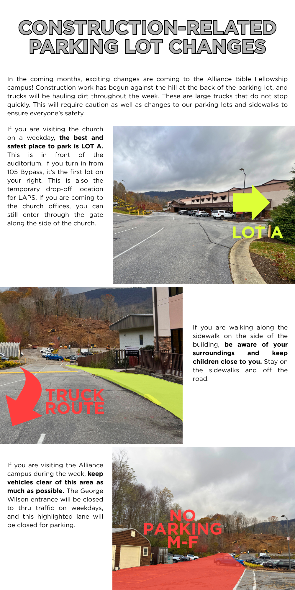 We will open the back parking lot on Sunday mornings. For safety reasons when we open that area for parking, our parking team will show you specifically where you can park, how to access it, and how to get back out of it. Stay on top of the asphalt and do not go near any equipment that might be parked in the area. This will be a very fluid situation. We will provide updates to keep you informed.